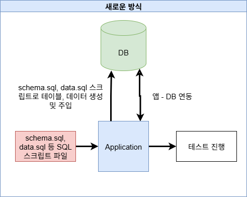 하지만 테스트 자동화 구축을 위해 이러한 방식에 변화가 필요했다. 그래서 필자는 결국 위 사진 1-2와 같은 방식으로 변경하였다. 해당 방식은, DDL 언어로 작성되는 테이블 등을 정의하는 SQL문이 작성된 schema.sql 파일, 그리고 테이블에 새로 삽입할 DML 구문이 작성되는 data.sql 파일을 스프링부트 프로젝트 내부에 삽입하는 방식이다. 이 방식을 이용하면 미리 DB에 테스트를 위한 테이블 및 데이터를 삽입하는 사전 작업을 따로 거치지 않아도 스프링부트에서 알아서 이 작업을 대신 수행해주기에 좀 더 편리하게 DB 연동을 할 수 있게 된다. 또한 앱을 다른 기기에서 실행해야할 때에도 그 기기에 DBMS만 설치되어 있다면 손쉽게 실행 환경을 마련할 수 있다는 것도 장점이다.